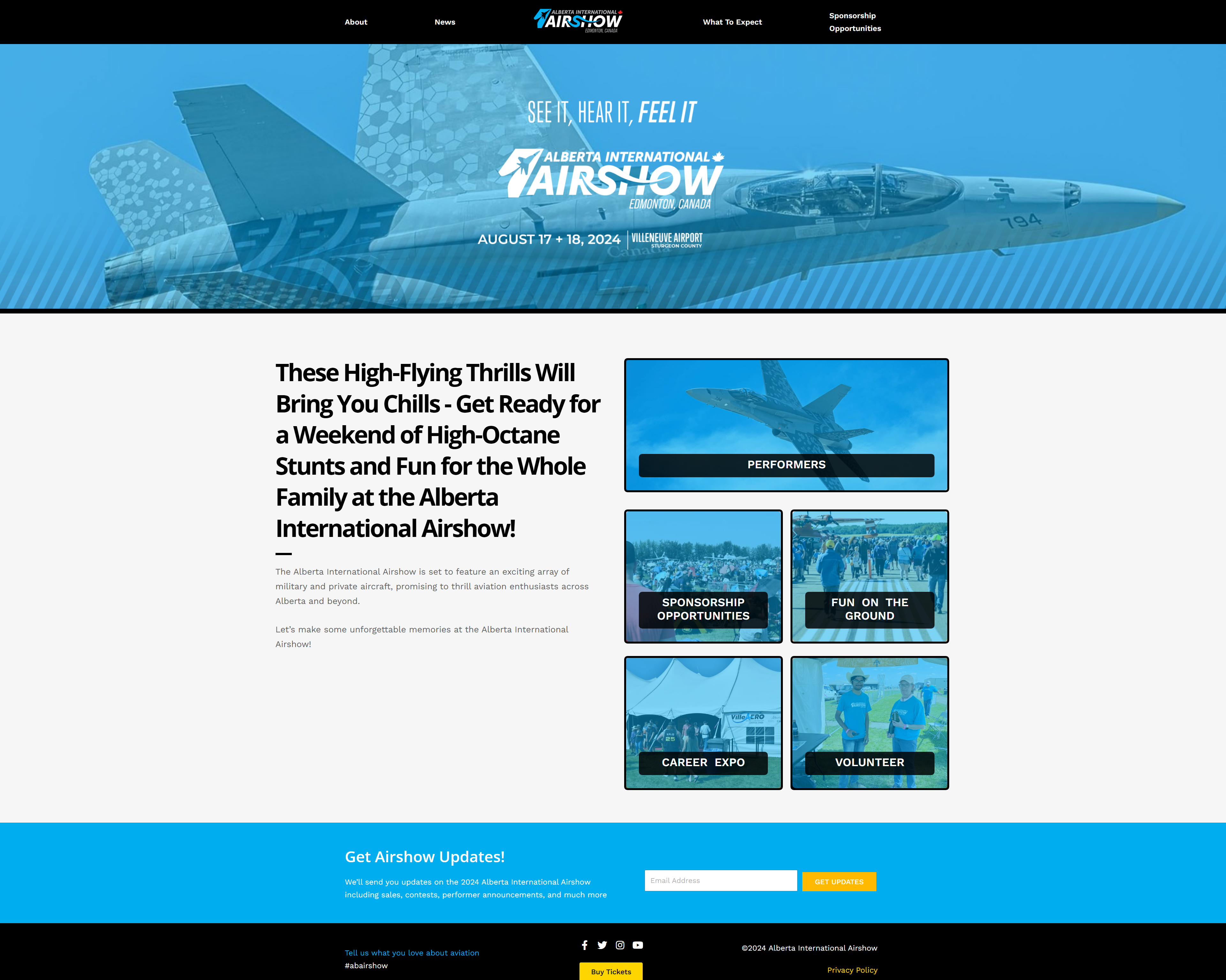 Alongside Focus Communications, I developed and designed the main site for the Alberta International Airshow event in Alberta, Canada. It was developed for the Wordpress platform using PHP, HTML and CSS for additional functionality to display the information for the event ranging from the performers to their latest news to their static displays.
